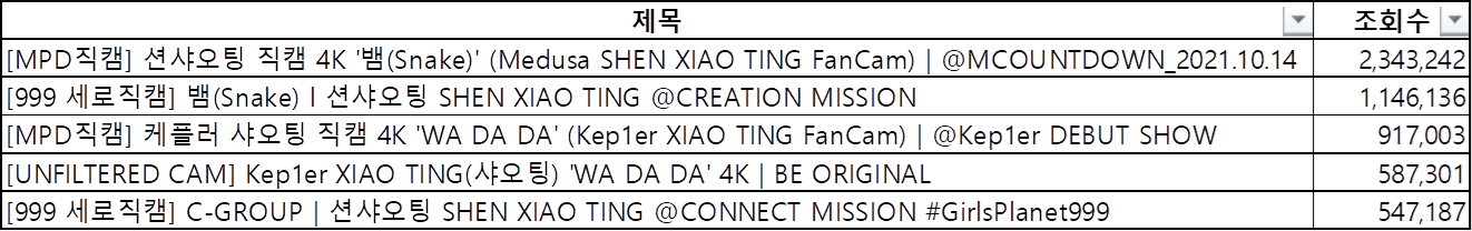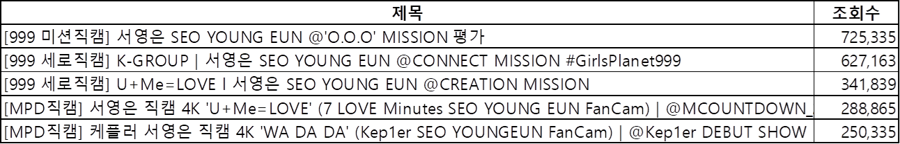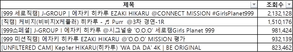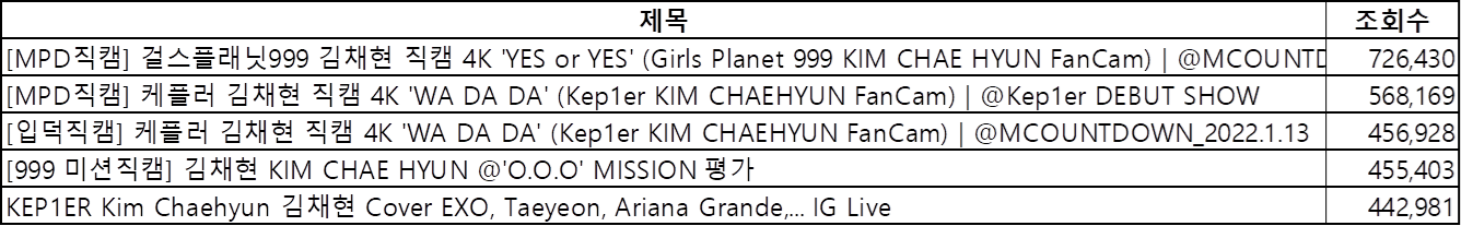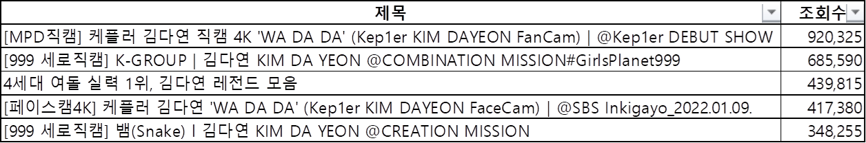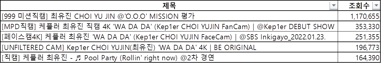 유투브에서 멤버별 직캠 조회시 조회수 상위 5개합 기준으로 인기순위를 정리해봤습니다.