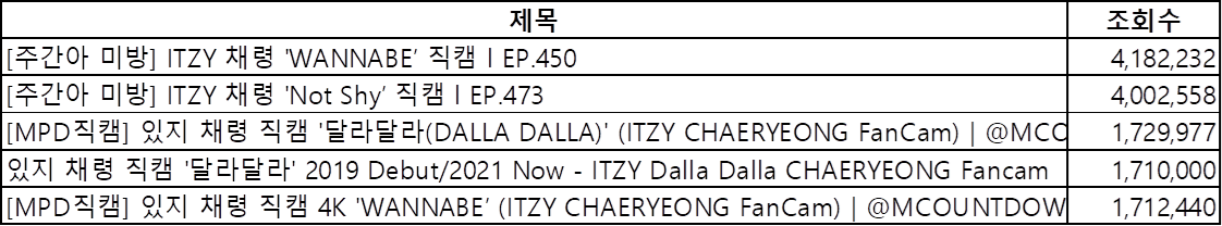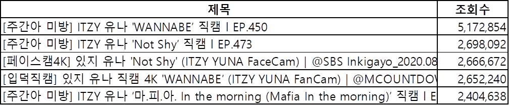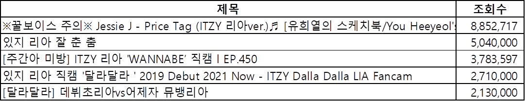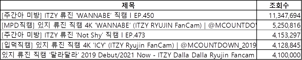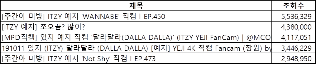 유투브에서 잇지 멤버별 직캠 조회시 조회수 상위 5개합 기준으로 인기순위를 정리해봤습니다.