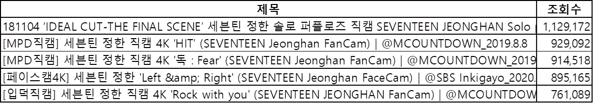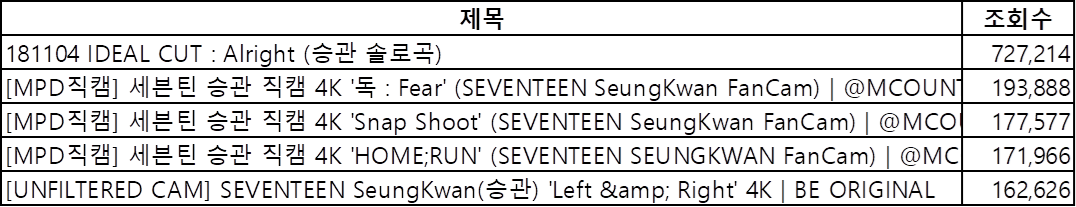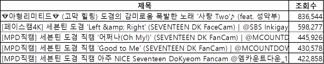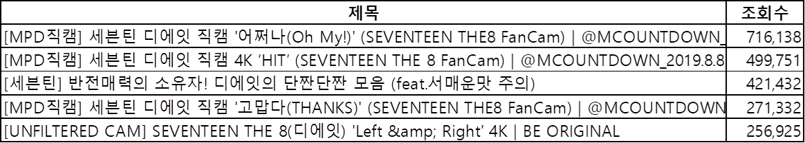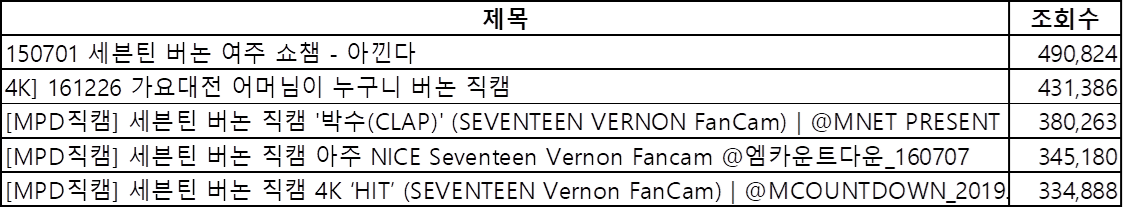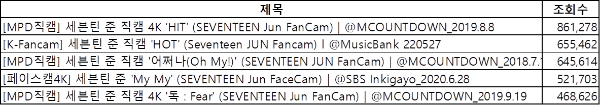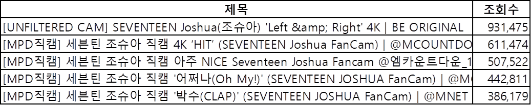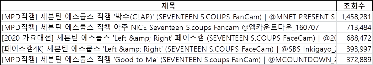 유투브에서 세븐틴 멤버별 직캠 조회시 조회수 상위 5개합 기준으로 인기순위를 정리해봤습니다.